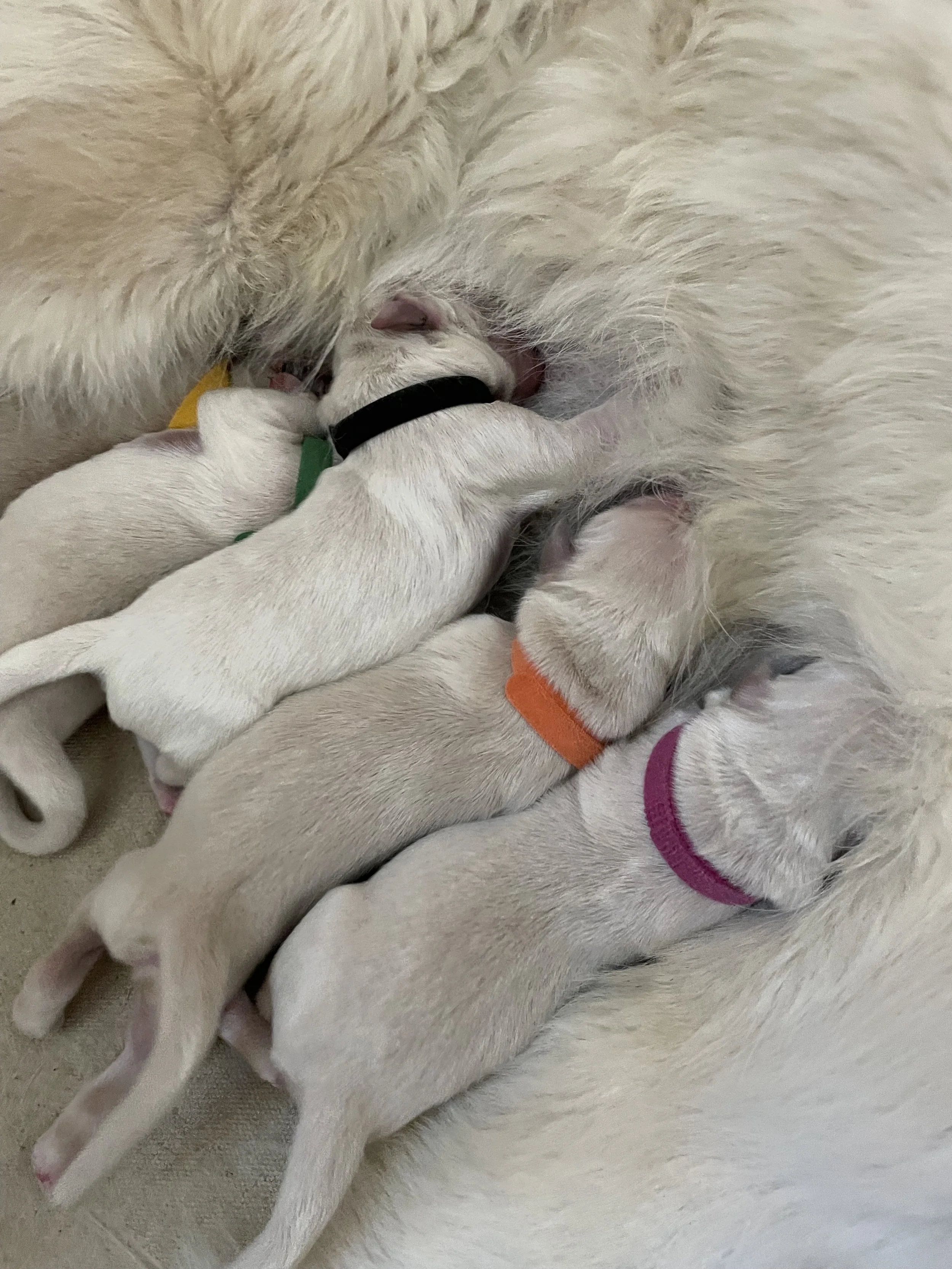 On the morning of July 31, 2025, Opal gave birth to her second litter of Golden Pyrenees puppies. Opal & Tucker are the proud parents of 10 new sweet babies - 4 females and 6 males. The puppies have all been named and their profiles will be added soon. Follow along on our instagram at the.town.farmhouse for frequent updates!