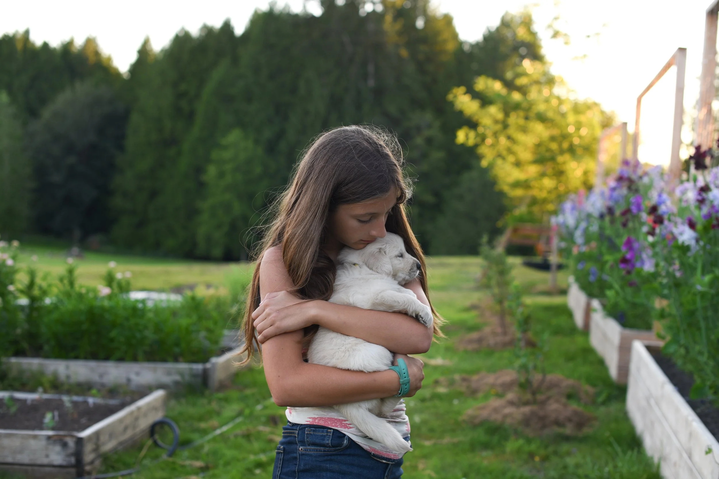 We offer on-site pickup at our home in Stanwood, WA. Our Golden Pyrenees puppies are raised on our little hobby farm with a variety of animals including chickens, ducks, cats, bunnies and goats. They are adored and doted on by our young children, family and friends. Our hope is to provide loving owners with healthy, happy puppies that are well accustomed to the sights, sounds and smells of a small farm, who are gentle and playful pets for all ages, and loyal protectors of their owners and homes.